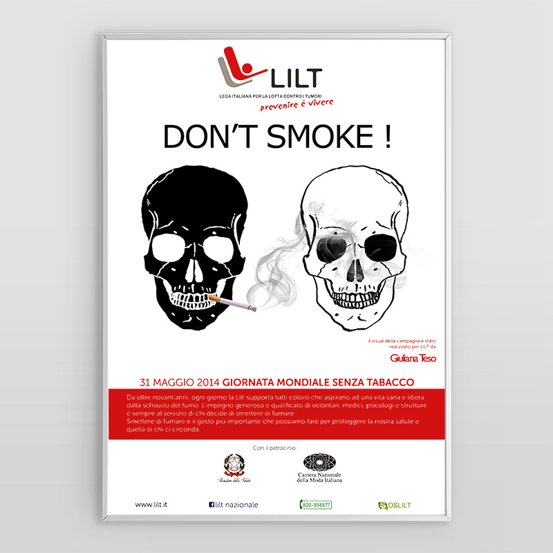 La locandina realizzata per promuovere la “Giornata Mondiale senza Tabacco”, che si tenutasi il 31 maggio 2014, si propone di comunicare in modo chiaro e immediato l’importanza di proteggere la salute individuale e collettiva. Il progetto grafico si basa su elementi visivi forti e simbolici: colori contrastanti richiamano l’attenzione del pubblico, mentre immagini legate al concetto di dannosità causate dal fumo trasmettono il messaggio di pericolo e quindi l’attenzione alla prevenzione.